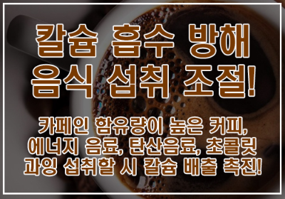 칼슘 자체의 흡수를 저해하는 음식 종류들이 있습니다. 그중 가장 대표적인 것은 커피인데요. 풍부하게 들어있는 카페인이 칼슘의 체내 흡수를 방해하는 것으로 나타났습니다. 또한 카페인은 커피 이외에도 에너지음료, 탄산음료, 초콜릿 등에도 함유량이 높은 편인데요. 성인을 기준으로 카페인의 하루 권장 섭취량이 약 400mg 정도이기 때문에, 이 양을 초과해 과잉 섭취하지 않도록 해야 칼슘의 흡수율에 덜 영향을 끼칩니다. 그 외에 가공식품의 재료로 많이 첨가되는 인 역시 칼슘의 흡수와 연동된 물질이기 때문에 너무 많은 양의 섭취는 피할 필요가 있습니다.