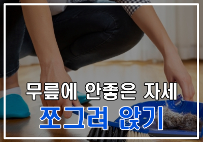 양반다리 만큼이나 무릎 관절을 망가뜨리는 자세는 쪼그려서 앉아 있는 자세인데요. 방에 걸레질을 하거나, 여러 작업을 진행할 때 장시간 쪼그려 앉아 있는 경우가 있는데요. 이런 쪼그려 앉는 자세는 무릎의 각도를 접히게 하고, 관절을 감싸는 연골 부위에 심한 압력을 가하게 됩니다. 연구결과에 따르면 쪼그려 앉을 때 무릎 연골에 가해지는 압력은 자신의 체중의 약 7배 정도 육박한다고 해요. 이런 자세를 오랜 기간에 걸쳐 지속한다면 압력이 누적됨으로써, 되돌릴 수 없는 손상을 입힐 수 있습니다. 그리고 관절 내 염증이 생성되어 발생하는 관절염의 발병에도 매우 큰 영향을 끼칠 수 있다고 하니 주의해야 합니다.