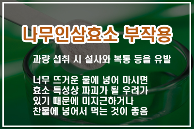 아무리 좋은 음식이라도 한 번에 너무 많은 양을 먹으면 필시 탈이 나기 마련이죠. 나무인삼효소도 예외가 아닙니다. 높은 함유량의 식이섬유에 의해 설사와 복통 등의 부작용을 겪을 수 있다고 하므로, 기재된 적정 섭취량의 범위를 초과해서는 먹지 말아야 합니다. 또한 너무 뜨거운 물에 넣어서 먹는다면 효소 특성상 쉽게 파괴가 될 수 있기 때문에 미지근하거나 차가운 온도의 물에 넣고 마시는 편이 좋다고 합니다. 그 외에 특이체질이거나 알레르기 체질인 분들도 증상이 발현될 우려가 있기 때문에 주의해야 합니다.