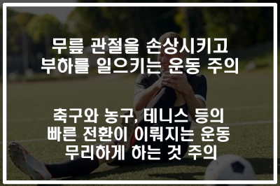 그 외에 축구나 농구, 테니스, 야구 등과 같이 빠른 움직임이 요구되는 운동도 너무 무리하면 무릎에 좋지 않은데요. 이러한 운동들은 공격과 수비를 하는 경기 과정에서 신속한 방향 전환을 하는 중 무릎에 순간적인 강한 압박이 가해질 수밖에 없기 때문에 조직의 파열이나 손상의 위험이 높은 편입니다. 그렇기에 너무 과도하게 하는 것은 피하도록 해야 합니다.