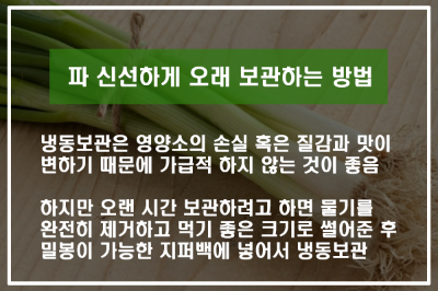 파를 보관할 때는 가급적 실온 상태에서 바로 사용하거나, 냉장보관을 하는 편이 좋고, 냉동보관하는 것은 권장되는 방법이 아닌데요. 파에 함유된 수분에 의해 쉽게 얼어버려서 영양소의 손실이 일어나기 때문이라고 해요. 뿐만 아니라 얼렸다고 다시 해동시키면 파 본연의 맛과 식감이 변하고, 파에 들어있던 수분이 녹는 과정에서 짓물러질 수 있습니다. 하지만 너무 오랜 시간 실온에 놔두거나, 냉장 보관을 하여 파가 완전히 상하는 것보다 맛과 식감이 조금 떨어지더라고 냉동보관하는 편이 차라리 나은 선택 방법이 될 수 있을 것입니다.
