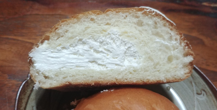 봉지를 뜯어보니 제법 두툼해 보이는 크림빵이 보입니다. 들어보니 크림의 영향인지 제법 묵직함이 느껴지더군요.