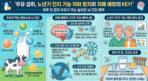 노년기의 가장 큰 두려움 중 하나는 뇌 기능 저하와 치매입니다. 뇌 건강을 유지하기 위해서는 다양한 비타민 B군이 필요한데, 그중에서도 비타민 B12는 신경 세포를 보호하고 뇌의 인지 기능을 유지하는 데 필수적인 영양소입니다. 비타민 B12가 결핍되면 기억력 감퇴, 우울증, 심할 경우 치매와 유사한 증상이 나타날 수 있는데요. 이 비타민은 주로 동물성 식품에 존재하는데, 노인들은 소화 기능 저하로 육류 섭취를 꺼리는 경우가 많아 결핍되기 쉽습니다. 우유는 훌륭한 비타민 B12 공급원이며, 매일 우유를 마시는 습관은 신경계를 안정시키고 뇌 세포의 노화를 늦춰 맑은 정신을 유지하는 데 도움을 줍니다. 또한 최근 연구들에 따르면 우유 속에 포함된 특정 단백질 펩타이드가 뇌의 인지 기능 저하를 방어하는 데 긍정적인 역할을 한다는 결과도 보고되고 있습니다.