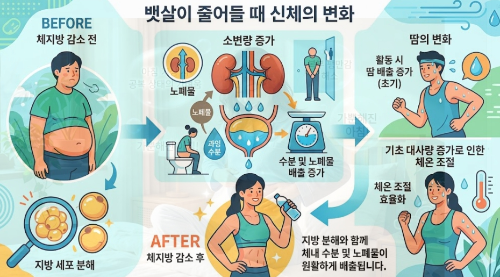 우리 몸에서 체지방이 분해되면 그 부산물은 이산화탄소와 물로 변하여 몸 밖으로 배출됩니다. 따라서 뱃살이 빠지는 시기에는 평소보다 소변을 보는 횟수가 늘어나거나 양이 많아지는 현상이 나타날 수 있습니다. 이는 물을 많이 마셔서가 아니라, 세포 내에 쌓여 있던 노폐물과 지방 분해 산물이 수분을 머금고, 수분 대사 과정이 활성화되기 때문입니다. 또한, 운동 시 땀이 예전보다 더 잘 나거나, 혹은 땀의 냄새가 옅어지는 변화를 느끼기도 합니다. 신진대사가 활발해지면서 체온 조절 능력이 향상되고 혈액 순환이 개선되었다는 신체적 증거입니다.